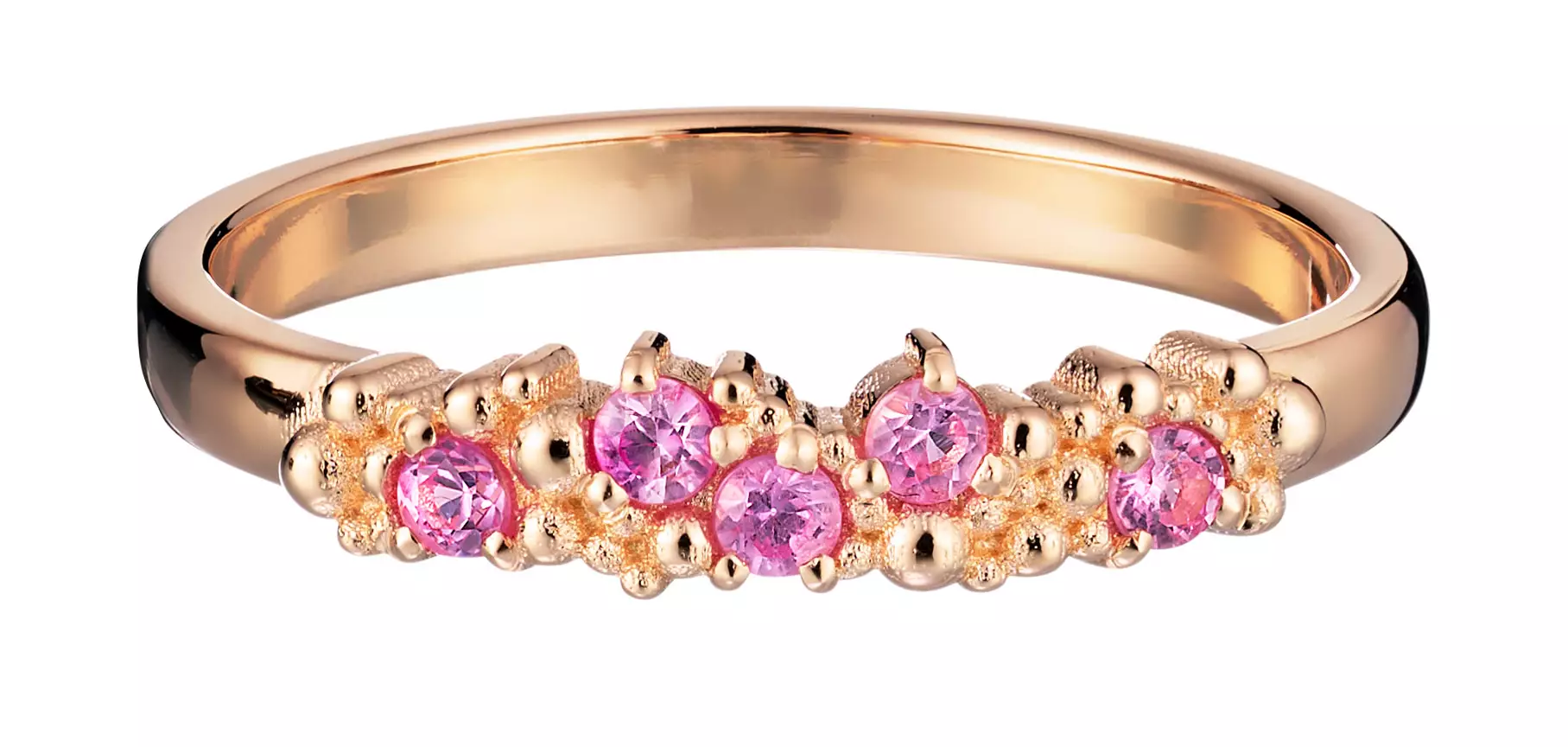 Upea täydennys Tiara mallistoon! Sormuksen siron koristeellinen istutus korostaa vaaleanpunaiset safiirien loistoa.