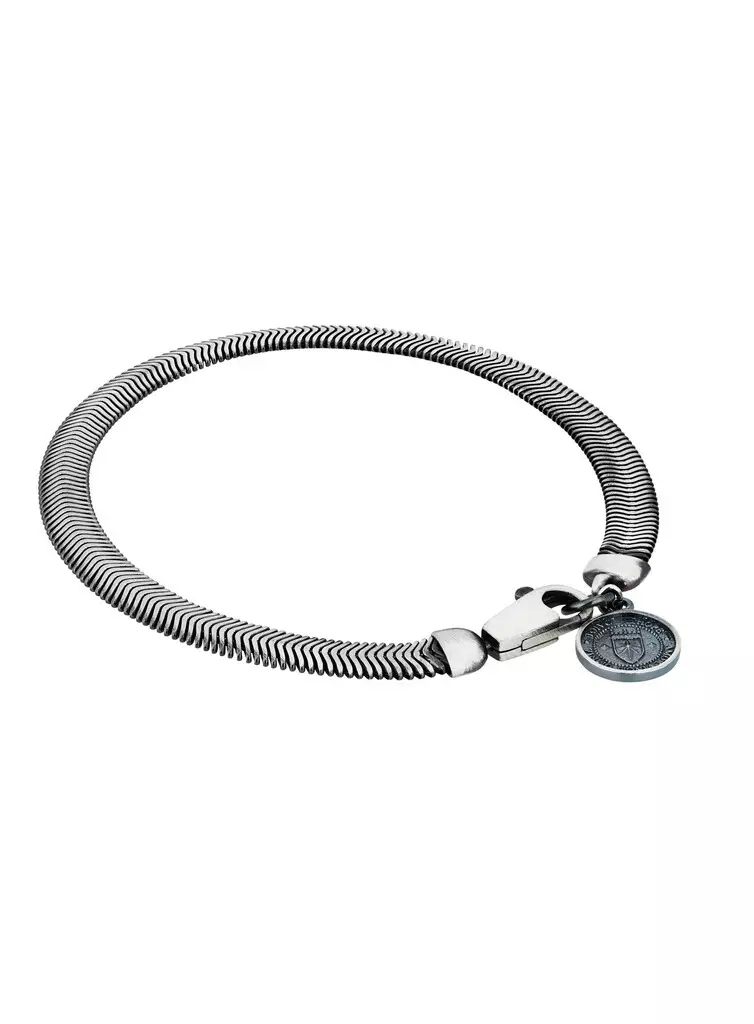 Toivo-rannekorussa on tyylikäs herringbone-ketju ja tummennettu, pieni toivo-amuletti, jossa vaakunakuvio ja ”Amor vincit omnia”-teksti.