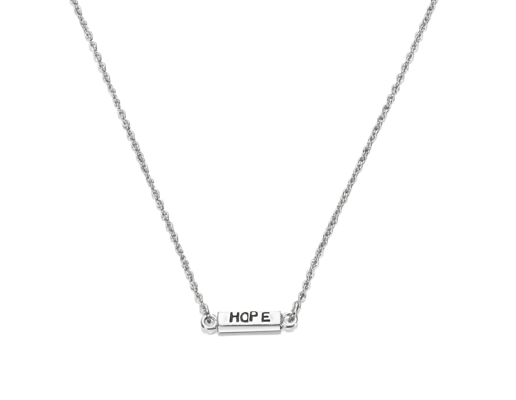 Koko: siron hopeaketjun keskellä on 7 mm hopeapalkki jossa teksti : HOPE