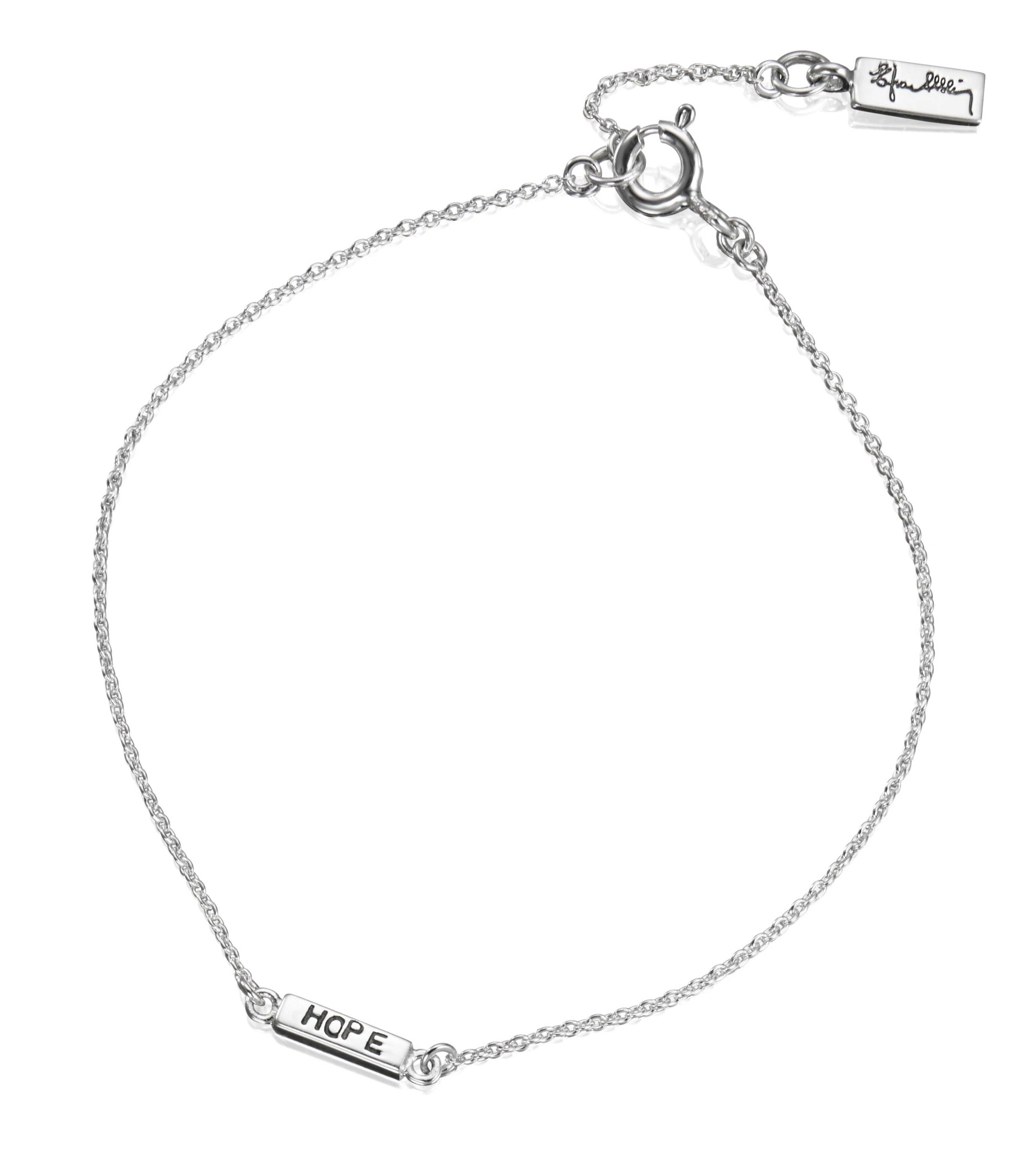 Koko: siron hopeaketjun keskellä on 7 mm hopeapalkki jossa teksti : HOPE