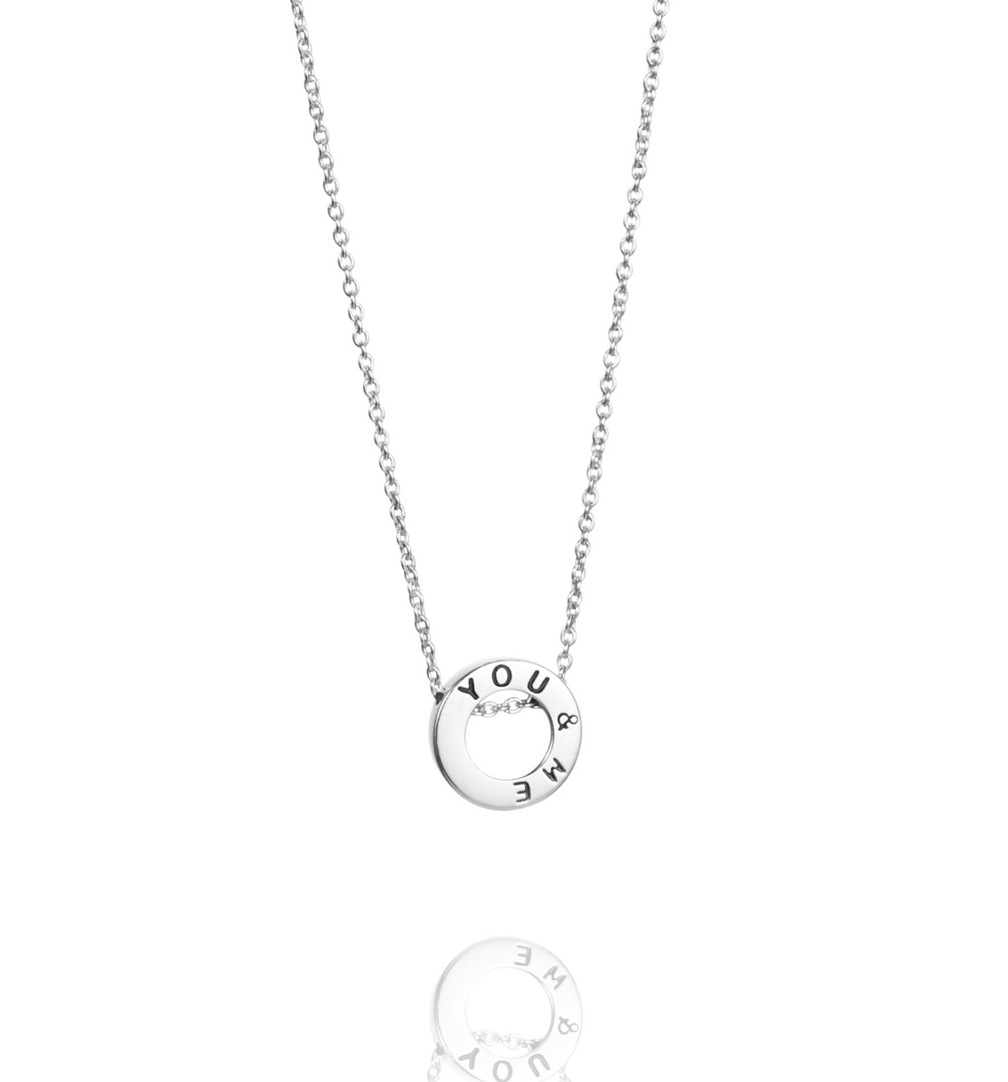 Koko: siron hopeaketjun keskellä pyöreä hopearengas (¤ 8,5mm) jossa teksi You & Me