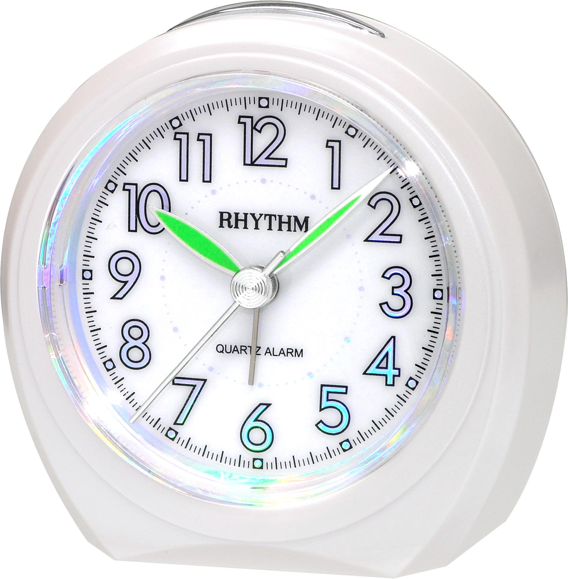 Rhythm helmiäisvalkoinen herätyskello hiljaisella käynnillä, kellossa torkku ja valo.