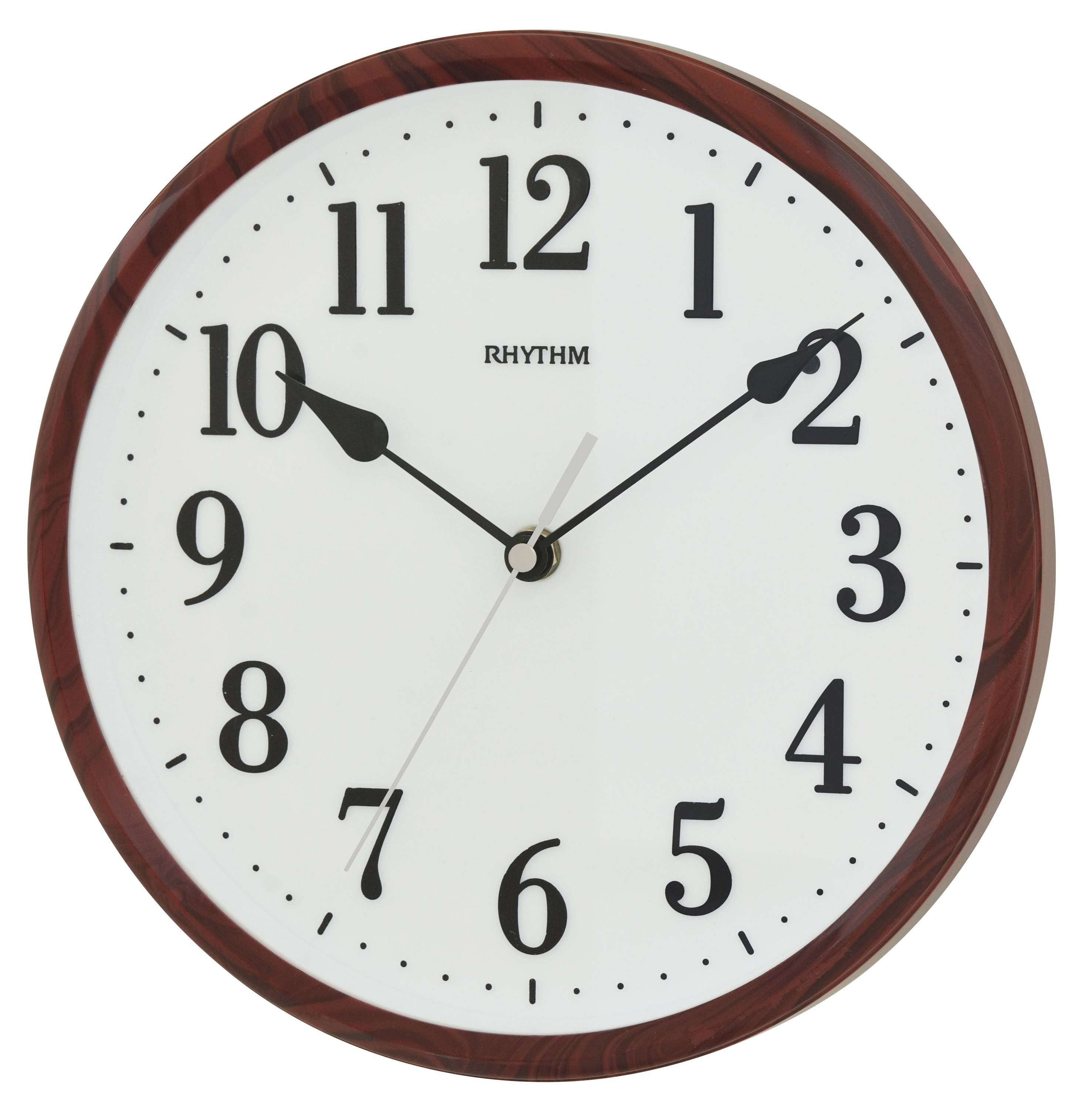RHYTHM punaruskea seinäkello puumaisella kuosilla selkeillä mustilla viisareilla
