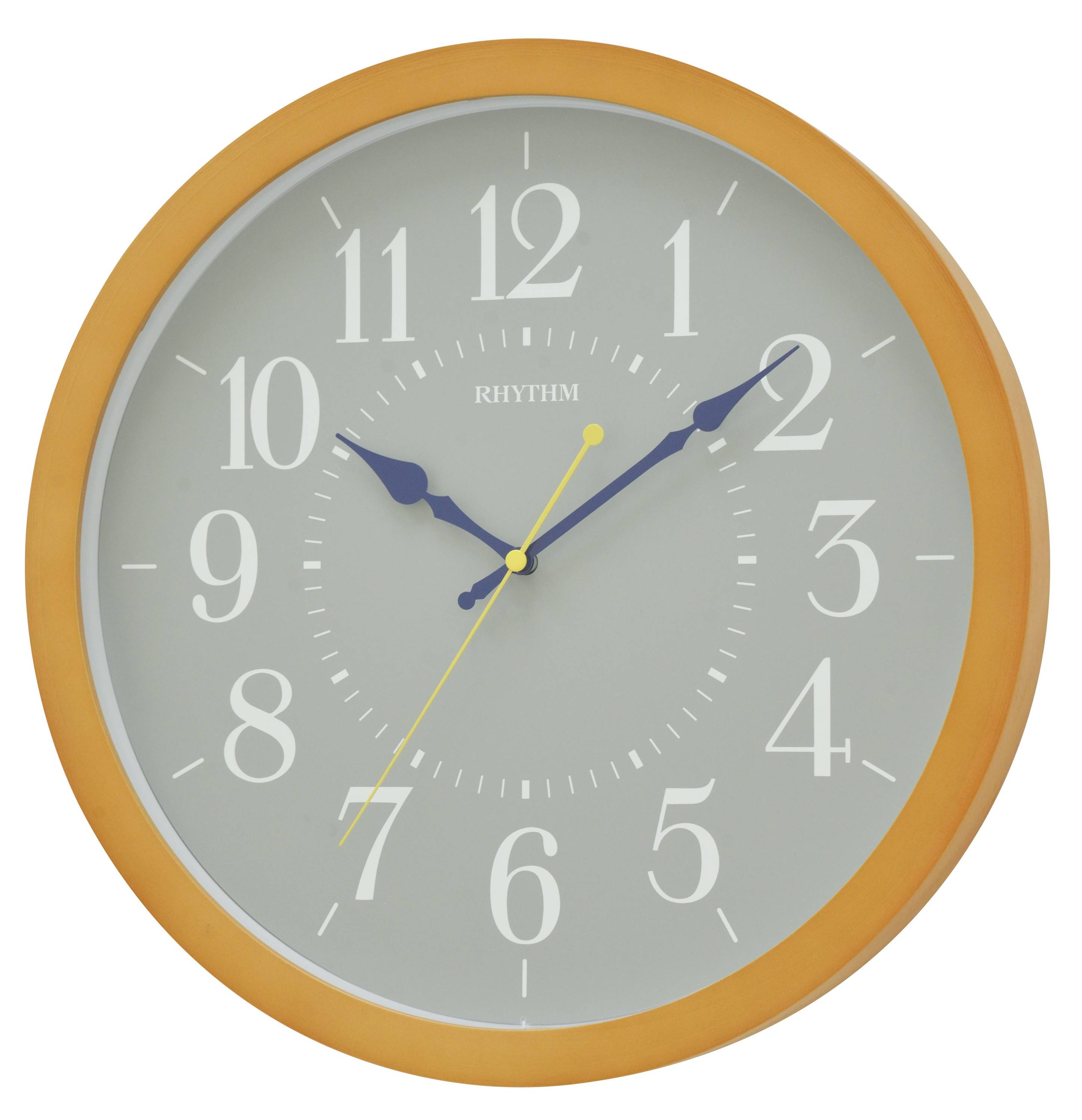 RHYTHM seinäkello kauniilla puunvärisellä ulkokehällä ja sinisillä viisareilla. Harmaasta kellotaulusta hyvin erottuvat valkeat numerot,pirteä keltainen sekunttiviisari