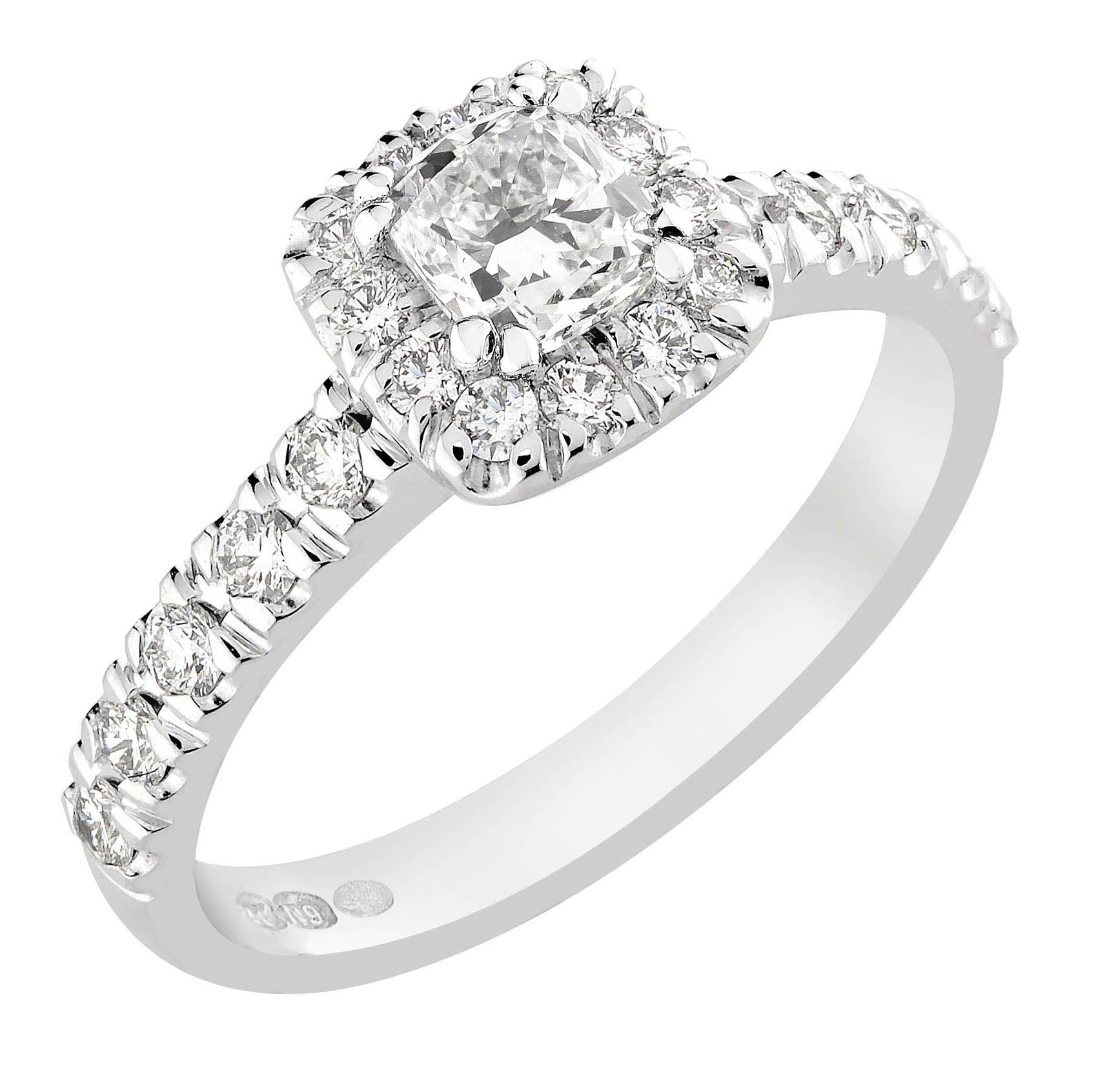 Timantit: keskikivi cushion 0,40ct + sivuilla briljantit yht. 0,42ct, timanttien kokonaispaino 0,82