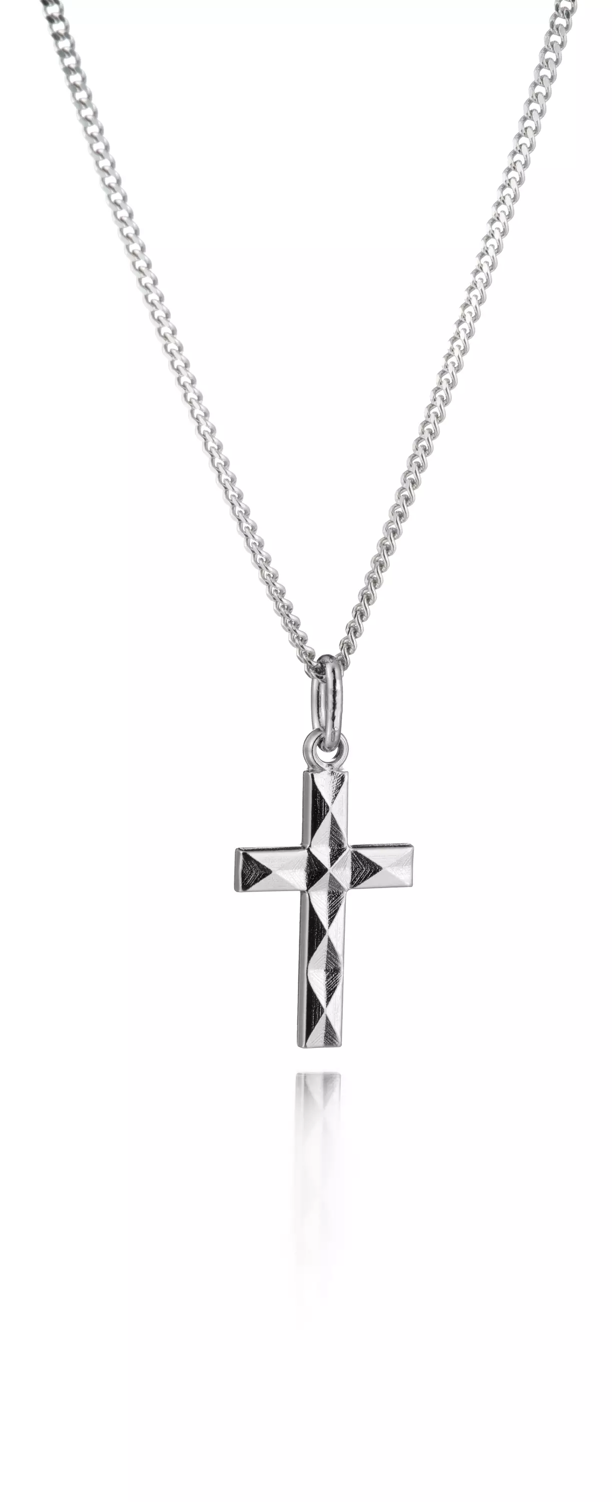 Saurumin hopeinen ristiriipus 42/45cm panssariketjulla. Ristin pitan tyylikkäästi kuvioitu.
