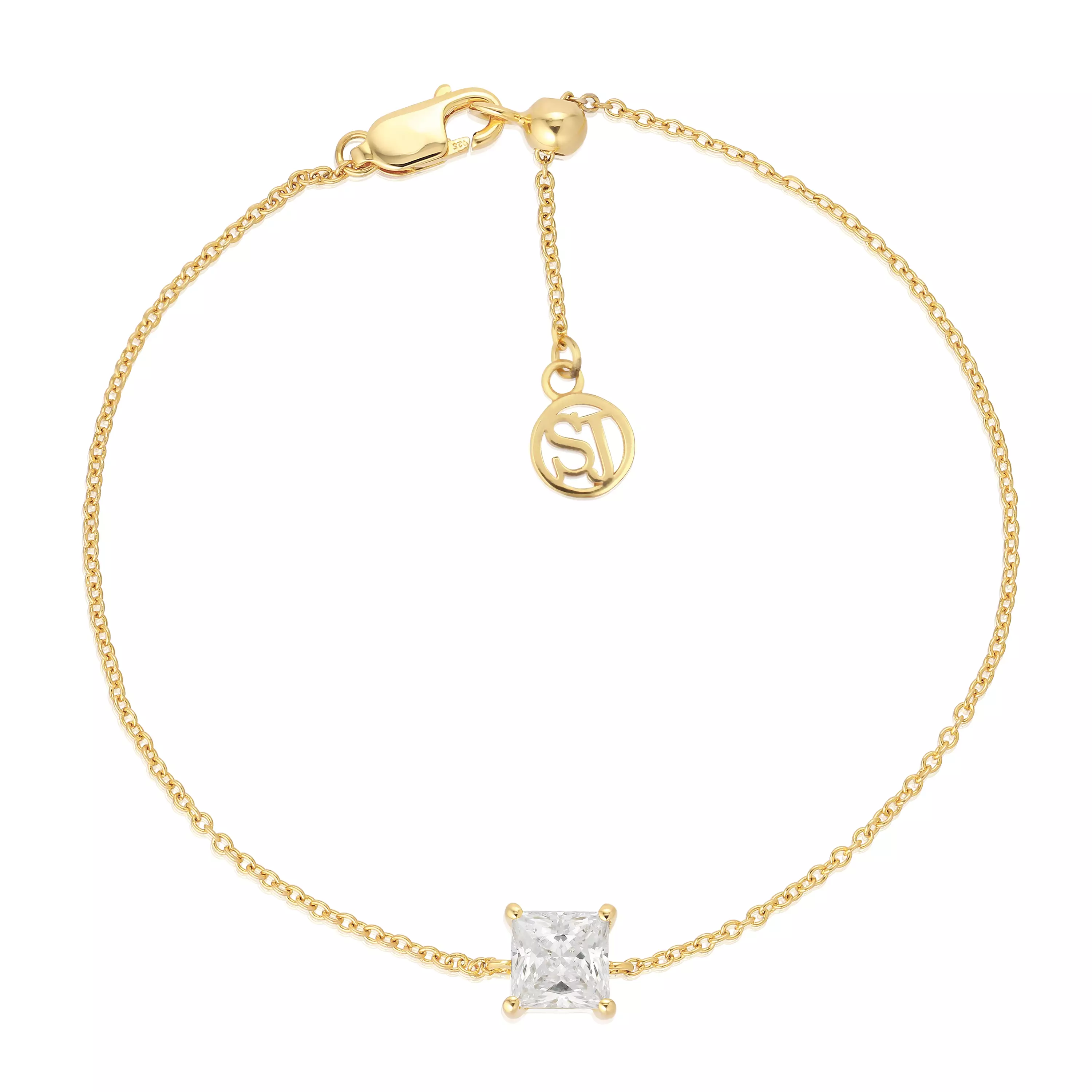 Sif Jakobsin sievä rannekoru jossa kirkas neliskanttinen zirkkon kullatussa ketjussa.