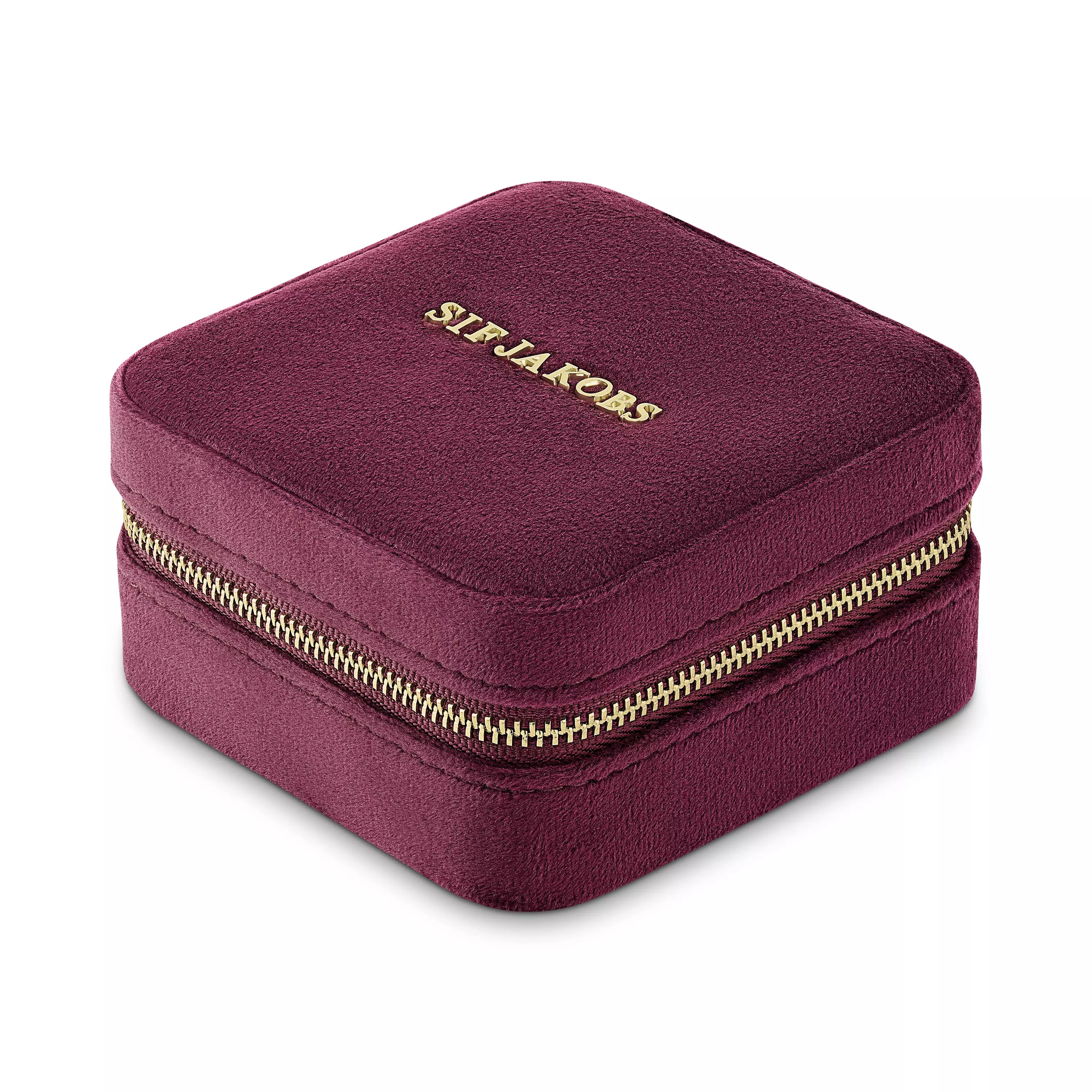 Tässä Sif Jakobsin ihanan burgrundyn punaisessa, samettipintaisessa korurasiassa korut pysyvät järjestyksessä.
