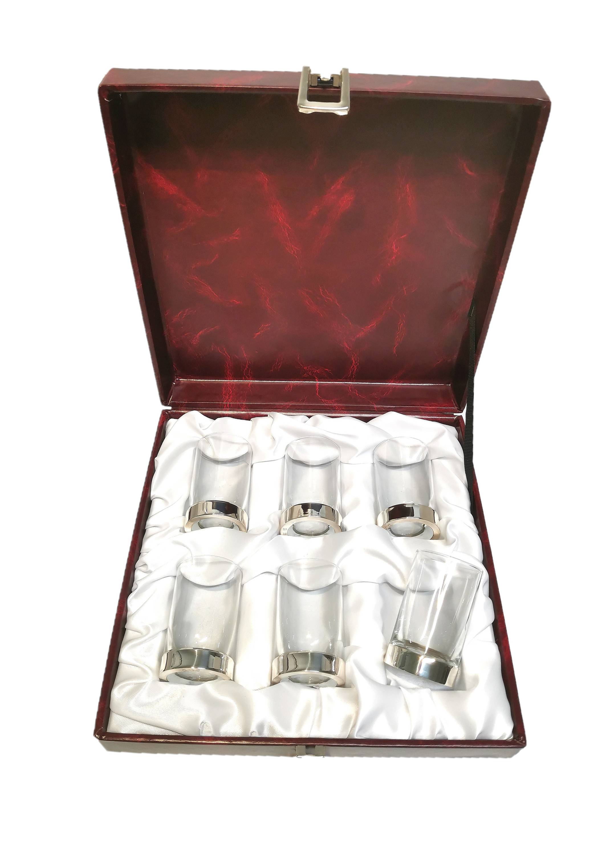 Snapsilasi setti 6kpl Kultakeskus Oy Materiaali: lasi, 925 hopea panta Koko: korkeus 7cm, halkaisija 4cm