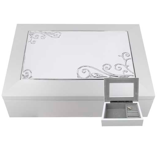 Kannessa kiillotettu metallilaatta koristeilla ja sisällä peili