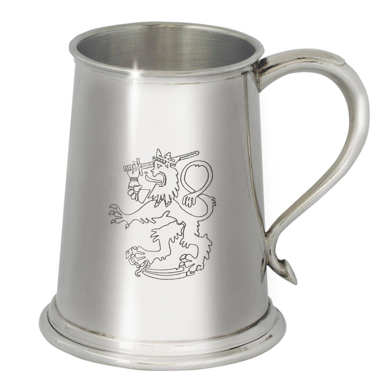 Tuoppia koristaa kaiverrettu suomileijonan kuva