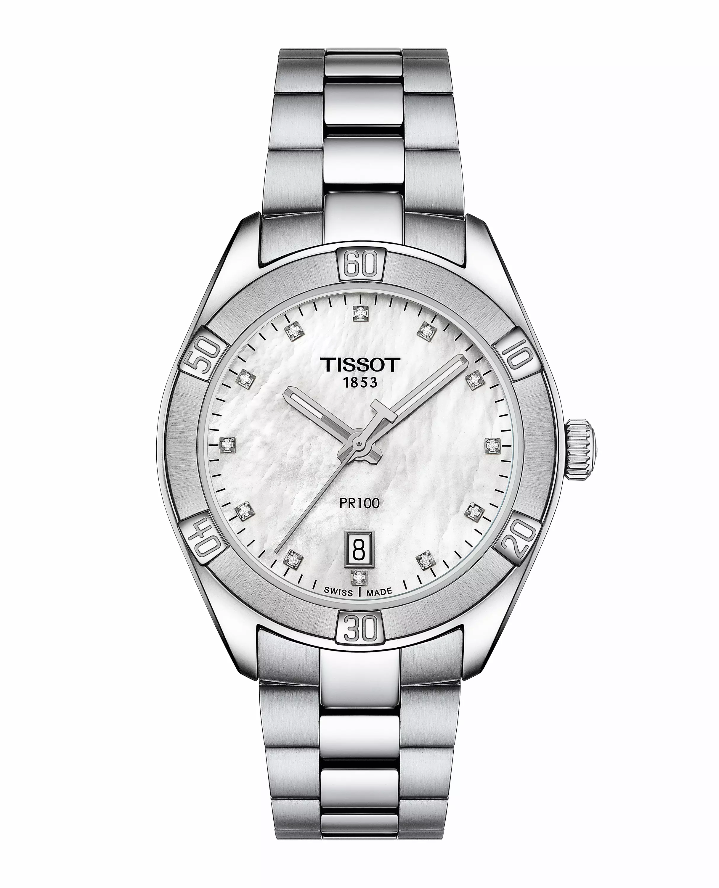 Tissot PR 100 Sport Chic - näyttävä, sporttinen naisten rannekello jossa kaunis helmiästaulu jota koristaa timantit.