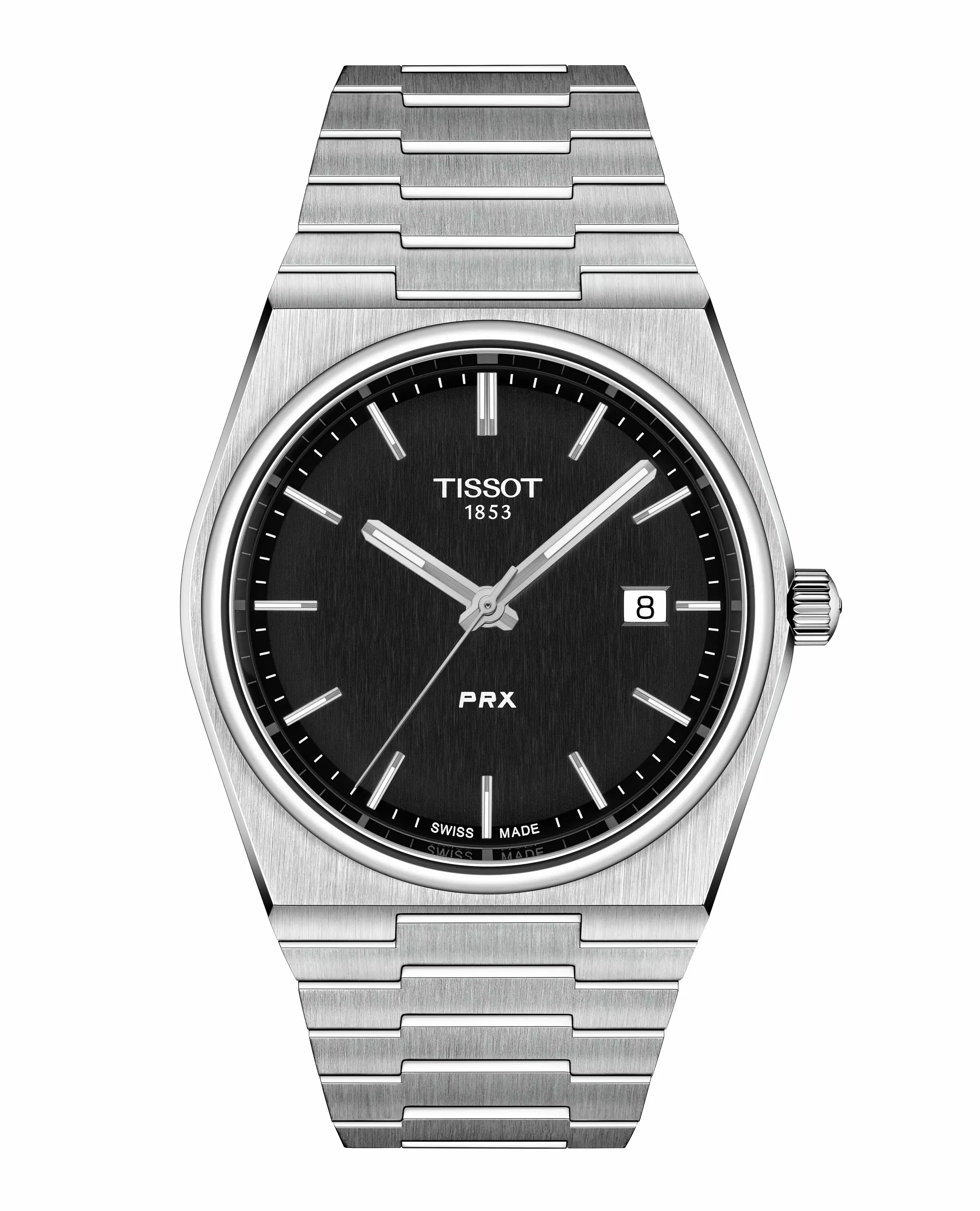 Tissot PRX - miesten rannekello mustalla kellotaululla ja metalli rannekkeella.