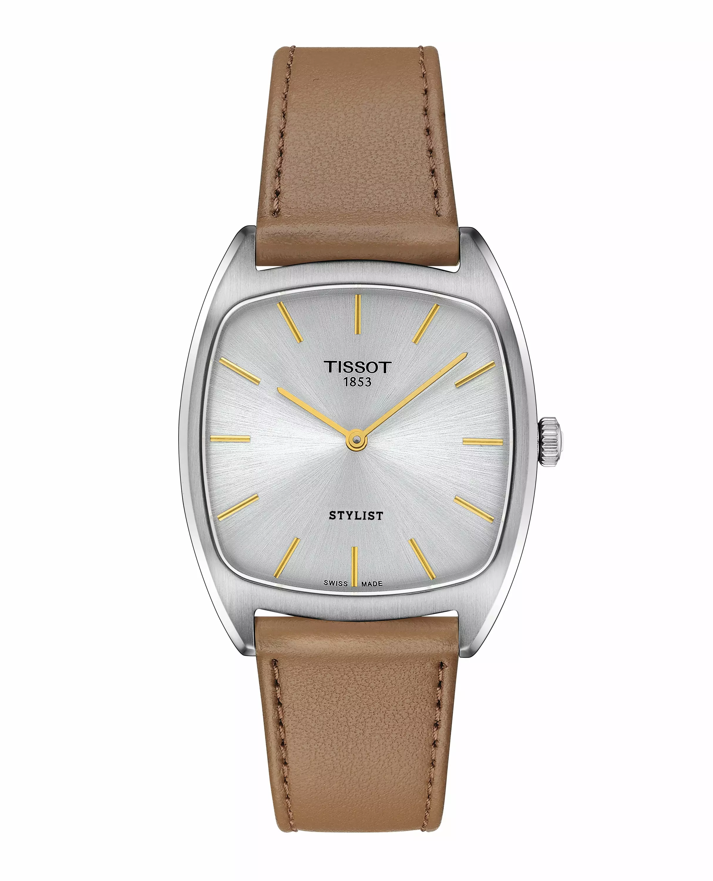 Tissot Stylist naisten retro henkinen rannekello kantikkaalla kellotaululla ja kauniin vaaleanruskealla nahkarannekkeella.