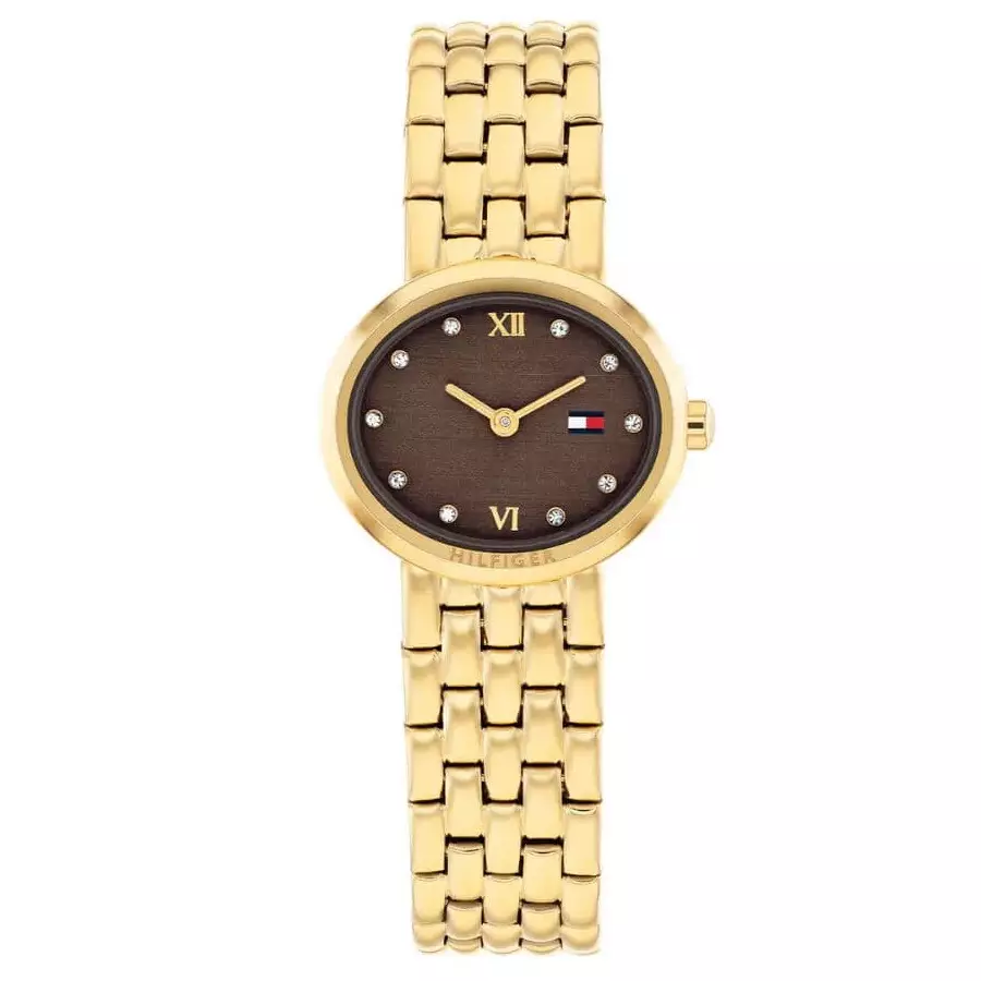 Tommy Hilfiger - kaunis kullanvärinen naisten rannekello ruskealla kellotaululla.