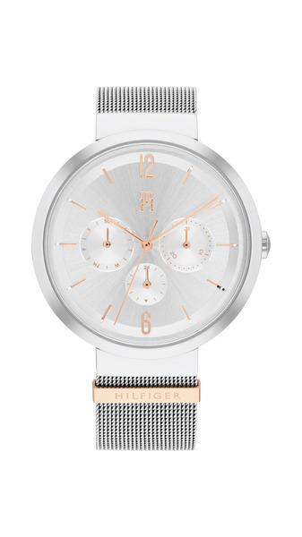 Tommy Hilfiger Lidia naisten rannekello mesh rannekkeella. Kellossa ruusukullan sävyiset tehosteet indeksit ja viisarit.