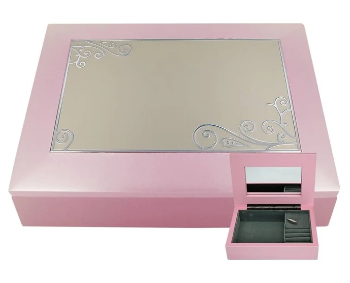 Soiva vaalenpunainen korurasia. Tyylikäs harmaa sisäpinta,sormuksille omat paikat. Musiikkina Fùr Elise.