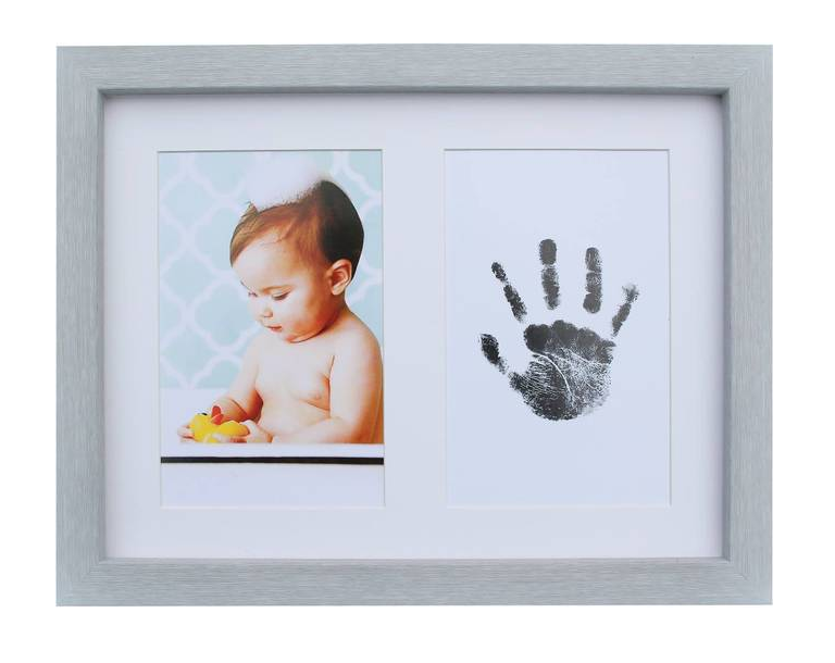 Mukaan tulee hopeanvärinen laatta, johon saa halutessaan kaiverruksen sekä mustetta jolla saa painettua kehykseen jalan/käden kuvan.